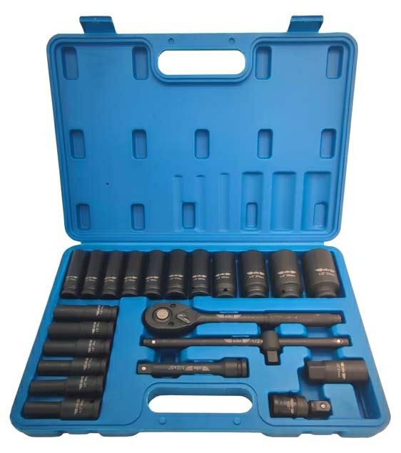 Nazwa : Zestaw Grzechotka + nasadki udarowe 1/2″ – 23 elementy Kod towaru: 3553.6 Materiał: Stal chromowo-molibdenowa Cr-Mo Średnica trzpienia: 1/2″ Zawartość zestawu: Grzechotka 1/2″ Nasadki: 8, 10, 11, 12, 13, 14, 15, 16, 17, 18, 19, 21, 22, 24, 27, 30, 32mm Klucz do świec 21mm Przedłużka 125mm Pokrętło przesuwne 1/2″ 250mm Przegub 1/2″