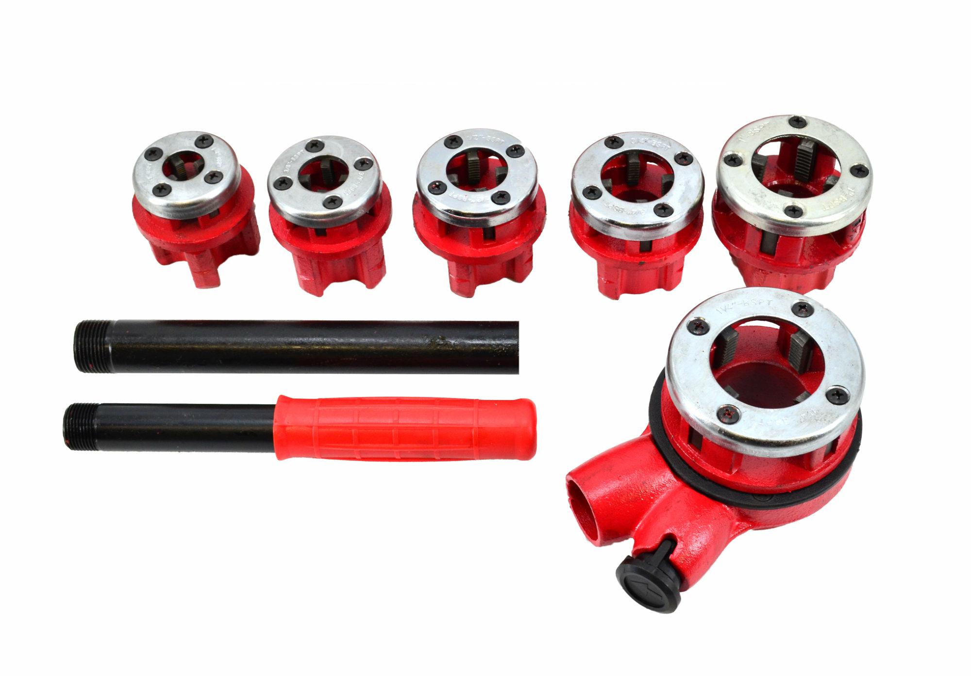 Żeliwna konstrukcja dostosowana do prac przy dużych obciążeniach. Hartowana i malowana proszkowo. 4 stalowe noże na głowicy zapewniają czyste i dokładne nacinanie gwintów. Każda głowica posiada cztery otwory do usuwania wiórów. 2-częściowy stalowy uchwyt oraz grzechotka z przełącznikiem zmiany kierunku obrotów. Przeznaczona do gwintowania gazowych rur żeliwnych lub rur z blachy czarnej, ocynkowanej. Sprawdzi się w budownictwie, hydraulice i podczas instalacji urządzeń. Zestaw zawiera: 6 x narzynki 1/4″; 3/8″; 1/2″; 3/4″; 1″; 1-1/4″ 1 x grzechotka 1 x uchwyt 2-częściowy walizka
