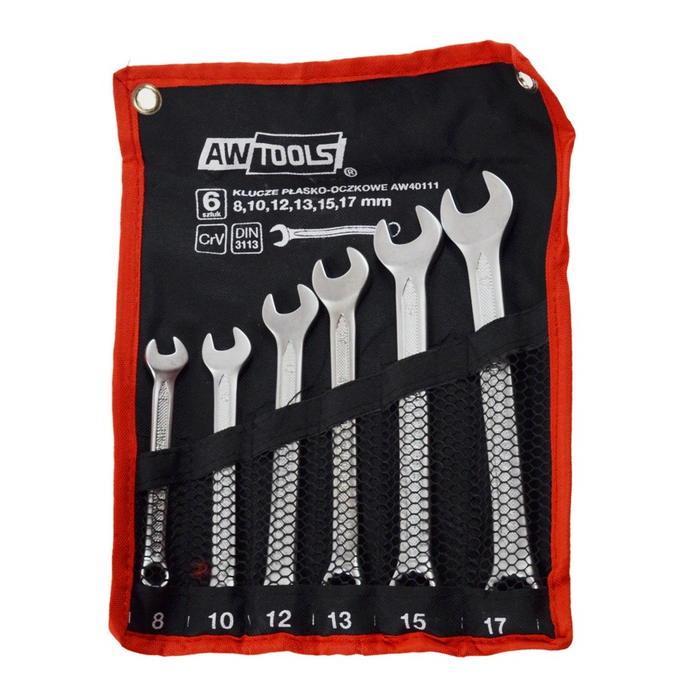 Wykonany ze stali narzędziowej chromowo-wanadowej (CrV). Kuty matrycowo, hartowany i odpuszczany. Satynowe wykończenie minimalizujące poślizg klucza. Posiada z jednej strony główkę otwartą, natomiast z drugiej strony główkę zamkniętą. Główka pierścieniowa odgięta pod kątem 15°, co ułatwia użycie kluczy na płaskich powierzchniach. Część chwytna radełkowana, dzięki czemu nie wyślizguje się z ręki. Czytelne oznaczenia rozmiaru dla szybszej identyfikacji. Przeznaczony do amatorskich jak i profesjonalnych zastosowań. Wyprodukowany zgodnie z normą DIN 3113. Całość w zwijanym etui z otworami do zawieszenia. Dane techniczne: Rozmiar: 8; 10; 12; 13; 15; 17 mm Ilość: 6szt. Waga: 600 g