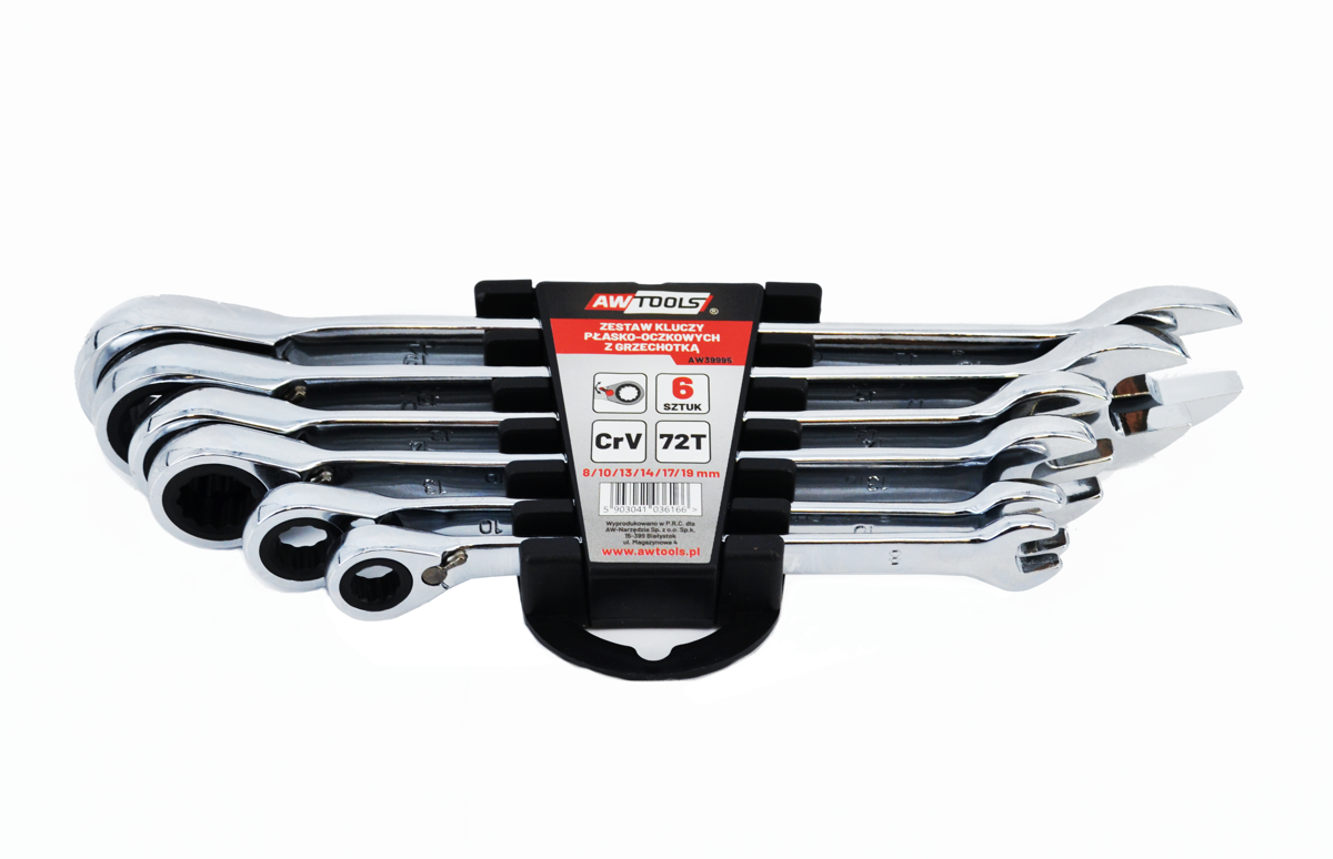 Wykonany ze stali narzędziowej chromowo-wanadowej (CrV). Kuty matrycowo, hartowany i odpuszczany, pokryty ochronną powłoką chromu z polerowanym wykończeniem. Posiada z jednej strony główkę otwartą, natomiast z drugiej strony główkę zamkniętą. Wyposażony w grzechotkę z 72 zębami i kątem wychylenia 5°. Przełącznik kierunku obrotów do szybkiej zmiany kierunku pracy grzechotki (prawo/lewo). Główka pierścieniowa jest odgięta pod kątem 15°, co ułatwia lepszy dostęp w ciasnych przestrzeniach. Czytelne oznaczenia rozmiaru dla szybszej identyfikacji. Przeznaczony do amatorskich jak i profesjonalnych zastosowań. Wyprodukowany zgodnie z normą DIN 3113. Całość na wieszaku z tworzywa do zawieszenia. Dane techniczne: Rozmiar: 8; 10; 13; 14; 17; 19 mm Ilość: 6szt. Waga: 830 g