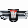 Wykonany z hartowanej i odpuszczanej stali CrV, z odporną na korozję chromowaną powłoką z polerowanym wykończeniem. Łączy w sobie cechy klucza płaskiegoz jednej strony, natomiast z drugiej klucza oczkowego. Obydwa zakończenia klucza ustawione pod kątem 15° dla optymalnego dostępu do elementu mocującego. Dzięki 72 zębom i skokowi grzechotki 5° zapewnia wysoki moment obrotowy oraz pracę w trudno dostępnych miejscach. Czytelne oznaczenia rozmiaru dla szybszej identyfikacji. Przeznaczony do odkręcania i przykręcania połączeń gwintowanych. Niezbędny przy pracach naprawczych i konserwujących. Całość na wieszaku z tworzywa do zawieszenia. Dane techniczne: Ilość: 7szt. Rozmiar: 10; 12; 13; 14; 15; 17; 19mm Waga: 1,2kg