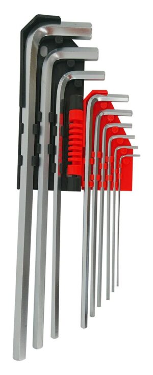 Wykonane z wysokogatunkowej stali CrV, niklowane. Odporne na odkształcenia i ścieranie. Hartowane części robocze. Fazowane krawędzie. Dłuższe ramie zapewnia lepszą dojście i większą siłę dokręcania. Plastikowy klips ułatwiający przechowywanie i transport. Oznaczenie rozmiarów kluczy na klipsie. Możliwość zawieszenia zestawu. Zestaw zawiera: Klucze: 1,5, 2,0, 2,5, 3,0, 4,0, 5,0, 6,0, 8,0, 10,0 mm Ilość: 9 szt. Typ: długie Waga: 440g