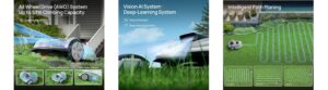 Zaawansowany system Vision AI analizuje otoczenie robota w czasie rzeczywistym i umożliwia bezpieczną pracę w dynamicznych warunkach ogrodowych. Robot rozpoznaje przeszkody takie jak: meble ogrodowe, zabawki, elementy małej architektury, zwierzęta domowe oraz ludzi. Algorytmy sztucznej inteligencji wybierają optymalną trasę przejazdu, pozwalając robotowi płynnie ominąć przeszkodę bez zatrzymywania koszenia. System zapewnia również precyzyjne koszenie w pobliżu drzew, rabat i krawędzi.